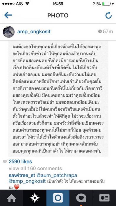 พร้อมกันนี้เจ้าตัวยังได้บอกว่าตอนนี้ทั้งตนและแฟนสาวขอเวลาเพื่อให้ทำความเข้าใจกับความรู้สึกของตนเองก่อน และเมื่อถึงเวลาตนกับแฟนสาวจะออกมาตอบคำถามในสิ่งที่ทุกคนสงสัยเอง