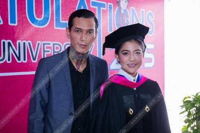 และทางด้านสาว มะนาว ศรศิลป์ มณีวรรณ์ เรียนจบจากสาขาวิชาสื่อสารการตลาด คณะนิเทศศาสตร์ ได้กล่าวปิดท้ายด้วยรอยยิ้มแห่งความสำเร็จว่า ดีใจและภูมิใจในตนเองว่าทำได้ เป็นความสำเร็จอีกขั้นให้ครอบครัวได้ภูมิใจ จบตามกำหนด วางแผนต่อปริญญาโทแน่นอนแต่ขอดูก่อนว่าจะเรียนด้านไหน แต่มองไว้ว่าไม่ด้านบริหารก็ด้านการตลาด ดูที่เหมาะสมกับเรา เว้นระยะไว้สักครึ่งเทอมก่อน ตอนนี้ลุยงาน ลุยธุรกิจของเราด้วย" นอกจากนี้ยังมีเพื่อนคนสนิท หนุ่มมิกค์ ทองระย้า มาร่วมแสดงความยินดีพร้อมกับดอกกุหลาบสีขาวช่อโตอีกด้วย.
