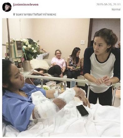 "วันนี้มีโอกาสได้มาเยี่ยมน้องเมย์ เธอที่โดนระเบิดหน้าพระพรหม เอราวัณ เมื่อวันที่ 17 ที่ผ่านมา ขอเป็นกำลังใจให้น้องกลับมาเเข็งเเรงไวๆนะคะ เเละขอส่งกำลังใจให้ผู้ที่ได้รับบาดเจ็บในเหตุการณ์ครั้งนี้ให้หายโดยเร็วที่สุด "