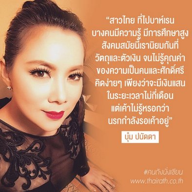 แต่ก็น่าแปลกใจปัจจุบันสาวๆ ที่ไปบางคนมีความรู้และการศึกษาสูงระดับปริญญาตรี ทำงานแบงก์ พยาบาล ครู บุ๋มยอมรับตามตรงว่าตกใจกับข้อมูลที่รู้ สังคมไทยเรานิยมกันที่วัตถุและตัวเงินจนไม่รู้ว่าคุณค่าของความเป็นคนและศักดิ์ศรีมันเหลืออยู่ตรงไหน คิดง่ายๆ เพียงว่าจะมีเงินแสนในระยะเวลาไม่กี่เดือน แต่เค้าไม่รู้หรอกว่านรกกำลังรอเค้าอยู่