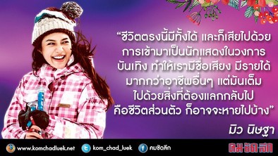การที่มาเป็นนักแสดง ต้องมีได้ และเสีย คิดอย่างไรกับคำนี้สำหรับมิวเห็นด้วย เพราะว่า ชีวิตตรงนี้มีทั้งได้ และก็เสียไปด้วย การเข้ามาเป็นนักแสดงในวงการบันเทิง ทำให้เรามีชื่อเสียง มีรายได้ หาเงินได้เอง มากกว่าอาชีพอื่นๆ แต่มันเต็มไปด้วยสิ่งที่ต้องแลกกลับไป คือชีวิตส่วนตัว ก็อาจจะหายไปบ้าง ช่วงเวลาพักผ่อน อย่างวันเสาร์ อาทิตย์ วันหยุดต่างๆ เราไม่มีวันว่างเลย ทุกวันนี้ ขึ้นอยู่กับตารางงาน หนูก็เคยคิดนะว่า ชีวิตส่วนตัวของมิวจริงๆ เคยคิดไว้ว่าอยากจะหายไป และทิ้งทุกอย่างไป ต่างประเทศสักแป๊บหนึ่ง เหมือนไปชาร์จแบตร่างกาย แต่ทุกวันนี้ ยังทำไม่ได้ก็เป็นเพียงแค่ความฝันอยู่