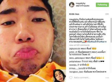 มีคนตั้งไอจีแอนตี้ มาด่า? "คือมันเป็นคนๆ เดียว ตอนนี้ให้เพื่อนตำรวจเช็กแล้ว เขาสร้างไอจีมาแล้วสิบกว่าอัน ใช้หลายชื่อมาก หลังๆ เริ่มตั้งเป็นคำหยาบ บางทีก็เอาชื่อเมย์ไปใส่ เขาสร้างเรื่องเหมือนพยายามจะดึงแฟนคลับคนที่เชียร์เราให้เข้าใจผิด ว่าเรารักสร้างกระแส หาว่าเราไม่ได้รักกันจริง แล้วเขาก็ด่าแฟนเมย์ว่าหน้าส้น และหาว่าเราไม่เอาจริงหรอก พยายามทำร้ายจิตใจเราสองคนตลอดเวลา เหมือนเขาอยากกดดันให้เราเลิกกัน แต่เท่าที่เมย์อ่านทั้งหมดเขาน่าจะเสียใจ อกหัก เขาน่าจะแอบรักแฟนเมย์มาก เลยทำทุกวิถีทาง และไปดึงแฟนเก่าเราว่าอันนี้รักจริงมากกว่า พยายามกดดันทุกอย่างให้เราดูไม่เหมาะสมกัน หยาบคายเยอะมาก เมย์พยายามอดทนแล้ว" รู้ตัวคนทำหรือยัง? "ตอนนี้สืบมาหมดแล้ว รู้สัญญาณโทรศัพท์ อีกนิดหนึ่งจะรู้แล้ว ยังไงตำรวจจะขออนุญาตไปทาง เอไอเอส ช่วยให้ความร่วมมือด้วยนะคะ เมย์รู้ข้อมูลเยอะแล้วแต่เมย์ต้องขอความข้อมูลจากเอไอเอส อยากให้เป็นกรณีตัวอย่าง โซเชียลอาจจะไปไว จับยากแต่ไม่ใช่ว่าจับไม่ได้ การที่เขามาเขียนแบบนี้สร้างความเสียหายเยอะ ถ้าเขาไม่สบายเมย์ก็อยากพาไปรักษา เมย์กับเจยินดีพาเขาไปรักษา ตอนแรกเราก็เห็นใจนะ เขาอาจจะเป็นแฟนคลับของแฟนเราและอาจจะชอบแฟนเรามาก ก็พยายามจะปล่อยไปแต่มันไม่ไหวจริงๆ"