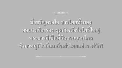 @มิ่งขวัญดวงใจ ชาวไทยทั้งผอง ทอแสงเรืองรอง ผุดผ่องดังร่มโพธิ์ใหญ่ พระบารมีเป็นที่ลือขานนามไกล ข้าบาทภูมิใจล้นเกล้าเผ่าไทยแห่งวงศ์จักรี