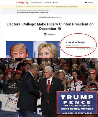 เดลีเมล์ สื่ออังกฤษ และสื่ออื่นๆ ทั่วโลกรายงาน ว่า มีประชาชนชาวอเมริกันที่ไม่เห็นด้วยกับผลการเลือกตั้งประธานาธิบดีสหรัฐฯ ที่ผ่านมาในวันอังคาร (8 พ.ย.)ได้ร่วมลงนามในคำร้องเกือบ 3 ล้านรายชื่อบนเว็บไซต์ Change.org ซึ่งถูกผลักดันโดยเลดี้กาก้า ศิลปินสายโปรเกรสซีฟที่มีชื่อเสียงของอเมริกา ในการต้องการให้คณะผู้เลือกตั้งอเมริกา (the Electoral College) ซึ่งมีอำนาจในการกลับผลการเลือกตั้งประธานาธิบดีสหรัฐฯ ตามกฎหมายสหรัฐฯ ให้เปลี่ยนการตัดสินใจโดยการลงคะแนนให้กับ ฮิลลารี คลินตัน จากพรรคเดโมแครตในวันที่ 19 ธ.คที่จะถึงนี้