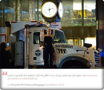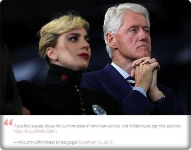 โดยสื่อสหรัฐฯ inquisitr ออกมาชี้ว่า เลดี้กาก้าที่ได้ชื่อว่าเป็นผู้สนับสนุนตัวยงของคลินตัน ได้ส่งข้อความทางทวิตเตอร์ในวันพฤหัสบดี (10) ประกาศให้ทุกคนในสหรัฐฯ ที่ไม่ต้องการให้ทรัมป์เป็นประธานาธิบดีสหรัฐฯคนต่อไป ให้ร่วมลงรายชื่อในคำร้อง พร้อมกับลิงค์ของคำร้องหลังจากลงชื่อ #CountryOfKindness (@ladygaga)