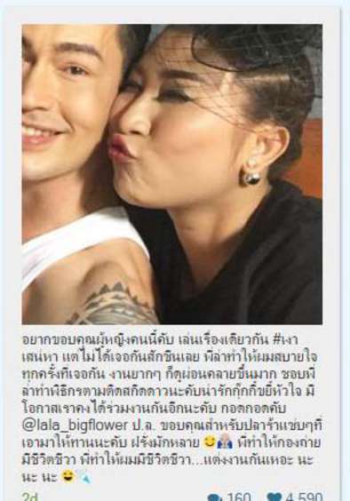 “มันไม่ใช่เริ่มคบกันแต่มันมีความรู้สึกว่าคุยกันมากขึ้นค่ะ จากแต่ก่อนที่ได้ถ่ายด้วยกันก็ยังเขินๆ ที่จะคุยเพราะเขาก็ระดับพระเอก พอได้เจอกันเยอะขึ้นๆ เลยรู้สึกว่าเข้าใกล้เขามากขึ้น จากแต่ก่อนเราก็กลัวเขา เพราะมาดพี่เขาก็จะนิ่งๆ แต่พอได้คุยกับเขา ลาล่าก็อยากได้วิชากับเขาด้วย ก็เลยรู้สึกอยากคุยกับเขามากขึ้น จากเล่นละครคอมเมดีอย่างเดียว แต่วิชาที่เขาให้เรามา เขาสามารถทำน้ำตาให้เราเห็นได้เราก็รู้สึกอะเมซิ่งจังเลย พอเห็นว่าเขาขอบคุณเรา เราก็นึกว่าเขาเล่นๆ เขียนมาเล่นๆ ว่าขอแต่งงาน เราก็แบบมันกลายเป็นข่าวได้ไง”