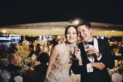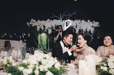 อั๋น : “เราไม่ได้ให้ความสำคัญกับตรงนี้เท่าไหร่นะครับ เพราะเรามองข้ามเรื่องพวกนี้ไปเลย แต่เราก็จัดแบบเหมาะสมตามสมควร มีแก้วแหวนเงินทอง ตามสิ่งที่มันพึงจะเป็นมงคล อีกอย่างทางฝ่ายคุณจ๋าเขาก็ไม่ได้มีการรีเควสใดๆ ด้วย แหวนก็ 5 กะรัตกว่าครับ แต่ว่าแหวนในโบสถ์จะเป็นอีกวงหนึ่งนะครับ วงนั้นจะเป็นแหวนที่เราใส่กันประจำทุกวัน ส่วนวงนี้อาจจะใหญ่เกินไปหากต้องใส่ทุกวัน (หัวเราะ) จริงๆ เพชรเม็ดนี้เป็นเพชรที่ผมซื้อเก็บไว้นานมากแล้วนะ ประมาณ 4 - 5 ปี ถามว่าซื้อไว้ให้เขาเลยมั้ย ก็ซื้อไว้ให้นั่นแหละ และก็เคยบอกเขาด้วยว่าจะมอบให้กับเขาด้วย ส่วนตัวเรือน เป็นแบบเดียวที่คุณพ่ออั๋นมอบให้กับคุณแม่อั๋นในวันแต่งงานเลยครับ เหมือนเป๊ะทุกอย่าง”