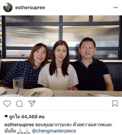 จากนั้นนางเอกสาวเอสเธอร์ ก็ได้โพสต์รูปของตัวเองพร้อมด้วยคุณแม่และออร์แกไนเซอร์คนดังกล่าว พร้อมข้อความว่า ขอบคุณมากๆ นะคะ ด้วยความเคารพและนับถือ