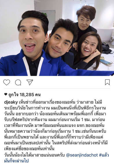 เห็นข่าวที่ออกมาเรื่องของฌอห์ณ ว่ามาสาย ไม่มีระเบียบวินัยในการทำงาน ผมเป็นคนนึงที่เป็นพิธีกรในงานวันนั้น อยากบอกว่า น้องฌอห์ณเดินมาพร้อมพี่เอกกี้ เพื่อมาบรีฟสคริปต์จากทีมงาน ผมมาก่อนงานเริ่ม 1 ชม. มาก่อนเวลาที่ทีมงานนัด มาพร้อมฌอห์ณและแจง ผจก.ของฌอห์ณ นั่นหมายความว่าน้องมาก่อนเริ่มงาน 1 ชม. เช่นกันนะครับ พี่เอกกี้เป็นพยานได้ และงานนี้พี่เอกกี้ก็ทราบว่ามีเพียงแค่ฌอห์ณมาเป็นเซเลบเท่านั้น ในสคริปต์ที่ส่งมาก่อนล่วงหน้าก็มีเพียงแค่ชื่อฌอห์ณเท่านั้น วันนั้นน้องไม่ได้มาสายแน่นอนครับ แท็กชื่อไอจีฌอห์ณ #แล้วมันก็จะผ่านไป
