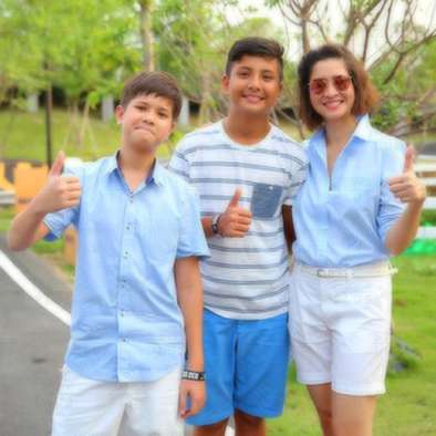"เราก็เป็นคนธรรมดามาก อาจจะเป็นแม่ของลูก ต้องไปไหนมาไหนกับลูกเหมือนคนทั่วไป ลูกจะไปดูหนัง จะไปไหน เราก็ต้องใช้ชีวิตปกติที่สุดเพราะลูก เราคิดว่าเราเป็นแม่ของลูก เวลามากองเราเป็นนักแสดง แต่เวลาที่เหลือเป็นแม่ของลูกมากกว่า เป็นแม่ที่ลูกเรียกให้ไปด้วยดีกว่าไม่ไป ไปก็ไปส่งแล้วก็ไปรับ แต่เดี๋ยวนี้เขาเริ่มติดเพื่อนแล้ว แต่คนเล็กก็ยังให้พื้นที่เรา ชอบให้เราไปรับไปส่งที่โรงเรียน ยังชอบคุยกันในรถ มันยังมีโมเมนท์ตรงนั้น ซึ่งเราว่ามันดีมากๆ เลย และเขาก็เริ่มที่จะมีคนคุยของเขากับอีกคนหนึ่ง บางทีเราก็เข้าไปคุยด้วยกัน 3 คนเลย ดีๆ ก็สนุกดีเหมือนกัน”