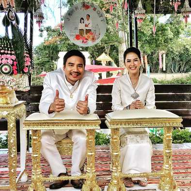 ซึ่งทั้งคู่สวมใส่ชุดเจ้าบ่าวเจ้าสาวสีขาวสไตล์ล้านนาดูเรียบง่ายแต่สวยงาม ฝ่ายเจ้าบ่าวก็ยกขบวนขันหมากมาสู่ขออย่างคึกคัก โดยมีครอบครัวและเพื่อนๆ มาร่วมงานกันมากมาย อาทิ เสนาลิง – สมเกียรติ จันทร์พราหมณ์ , จ๊อบ – นิธิ สมุทรโคจร , ทีน – สรวุฒิ พุ่มทอง ฯลฯ