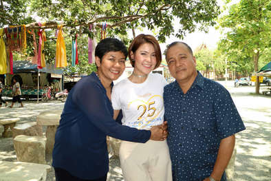 “60% ค่ะ ยังเด็กๆเลยครึ่งทาง เพราะว่าเราเองดูจากชีวประวัติ เราเองยังไม่ ได้อะไรสักนิด ชีวิตไม่ได้ลำบากขนาดนั้น ถึงประกวดมาก็จริง ฐานะปานกลาง พ่อเป็นคนส่งประกวดร้องเพลง จะลำบากในแบบฉบับของเรา แต่ดูชีวิตแม่ผึ้งเป็นครูชีวิตที่ให้ทุกคนได้ศึกษาสุดยอดจริงๆ” คอนเสิร์ตครั้งนี้มีเพชร ลูกแม่ผึ้งด้วย เคยเจอกันมาก่อนหน้านี้มั้ย “เคยเจอกัน แต่ยังไม่เคยร่วมงานขึ้นคอนเสิร์ตด้วยกัน ครั้งนี้จะได้เห็นพี่เพชรร้องเพลง ก่อนหน้าก็จะเห็นภาพพี่เพชรเป็นดีเจ พูดเพราะและเก่งทางด้านการพูด ได้มีโอกาสเห็นพี่เพชรร้องเพลงแม่ผึ้งบ้าง ก็ชื่นชมเลยค่ะ” เห็นว่าเปาจะมาเปลี่ยนชุดให้หุ่นแม่ผึ้งที่วัดทับกระดาน มาทำตรงนี้ได้ยังไง “จริงๆมาร้องเพลงบนเวทีที่นี่ตั้งแต่ 10 กว่าขวบ ก่อนมาเข้าแกรมมี่ เวลาประกวดเวทีใหญ่ๆ ออกรายการทีวี จะมาบน มาขอพร เป็นที่ยึดเหนี่ยว ก็สมหวัง มาแก้บน ของที่นำมาแก้บนก็แตกต่างกันไป ถ้าสมัยเด็กๆ เป็นโต๊ะเครื่องแป้ง ชุดไทย ตอนจะเข้าแกรมมี่ ประกวดรายการ คว้าไมค์ คว้าแชมป์ มาบนเป็นดอกกุหลาบเอามาเยอะมาก ท่วมเลย ส่วนที่เปลี่ยนชุด แต่งหน้า จริงๆเปาเป็นลูกมือมาช่วยป้าๆตัวตั้งตัวตี ป้าแดง ป้าเทิด ป้าเมย์ ที่มาเปลี่ยนชุดหุ่นที่ศาลาริมน้ำมากกว่า”