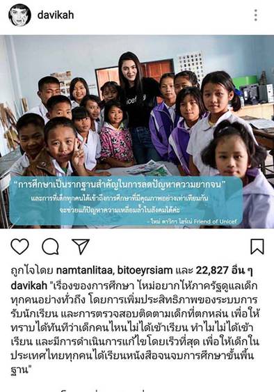 “ก็ดีใจค่ะ เป็นเกียรติมากๆ ที่ได้ลงพื้นที่จริง ไปที่เชียงราย เชียงใหม่ค่ะ ไปดูเรื่องการเป็นอยู่ของน้องๆ และเรื่องของการศึกษา มีเด็กหลายเชื้อชาติมากค่ะ บางคนพ่อแม่กลัวก็ไม่ยอมให้น้องออกมาเรียน ทางยูนิเซฟก็จะรณรงค์เรื่องนี้ให้พ่อแม่ปล่อยลูกออกมาให้ได้รับการศึกษา เพราะการศึกษาสามารถเปลี่ยนแปลงชีวิตคนๆ หนึ่งได้ให้มีชีวิตที่ดีขึ้นค่ะ ของเราเป็นแคมเปญโอกาสที่เท่าเทียม ตอนนี้เรียนฟรีด้วย ใหม่ก็อยากสนับสนุนว่าตอนนี้รัฐบาลก็ช่วยอยู่ค่ะ ได้ให้ความรู้กับผู้ปกครองด้วย และน้องๆ ก็น่ารักค่ะ เรามองแล้วว่าปัญหาตรงนี้มันใหญ่มากๆ เราอยู่ตรงนี้เราอาจจะมองไม่เห็น แต่จริงๆ มีเด็กจำนวนหลายล้านมากๆ ที่ยังไม่ได้รับการศึกษาและยังไม่ได้รับโอกาสที่เท่าเทียม แต่น้องๆ ที่ใหม่ไปเยี่ยมยังขาดโอกาสมากๆ ค่ะ ทั้งเรื่องของการศึกษาและที่อยู่อาศัย”