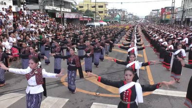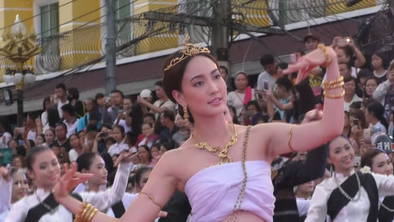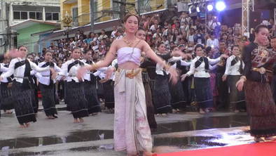 โดยเริ่มจากสี่แยกศรีเทพตัดถนนนิตโย ยาวไปถึงสี่แยกถนนอภิบาลบัญชาตัดถนนนิตโย ประมาณ 350 เมตร มีนางรำกว่า 450 คน ที่จะร่วมรำบวงสรวง พร้อมกับ “น้องแต้ว” เวลา 17.45 น. น้องแต้ว เดินทางมาถึงบริเวณต้นขบวน ร่วมเดินอัญเชิญเครื่องบวงสรวงร่วมกับ ผู้ว่าราชการจังหวัดนครพนม และคณะ