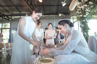 สำหรับในช่วงเช้าถือฤกษ์ดีเวลา 07.29 น. ทำพิธีสวมแหวนเจ้าบ่าวและเจ้าสาวเป็นการภายในครอบครัว โดยมี ก้อย-ทาริกา ธิดาทิตย์ ผู้จัดละครค่ายมาสเตอร์ วัน ซึ่งเป็นคุณแม่ของเจ้าบ่าว, นายภูมิสถิตและนางอัมภันตรี แจ่มปฐม คุณพ่อคุณแม่ของเจ้าสาว พร้อมด้วย นางจันทนา ตุมราศวิน คุณยายของเจ้าสาว ร่วมเป็นสักขีพยานรัก จากนั้นเวลา 08.29 น. คู่บ่าว-สาวร่วมตักบาตรพระสงฆ์จำนวน 9 รูป พร้อมกับรับศีลรับพรเพื่อความเป็นศิริมงคล และในเวลา 10.29 น. เข้าสู่พิธีรดน้ำสังข์ โดยมี นายประวิทย์ และ นางอรัญญา มาลีนนท์ ให้เกียรติเป็นประธานเจิมหน้าผากและสวมมงคลคู่บ่าวสาว