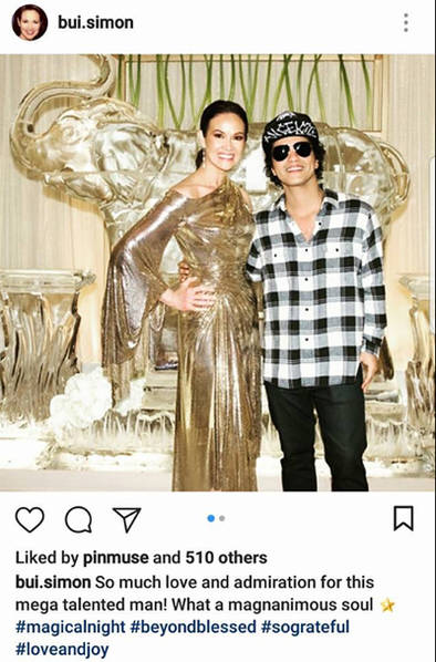 ทั้งนี้ ทางด้านของอดีตนางงามจักรวาลคนดังก็ ได้มีการโพสต์ภาพและ ข้อความ ผ่านอินสตาแกรม @PUI.SIMON ที่มีการตั้งเป็นส่วนตัวระบุว่า...“SO MUCH LOVE AND ADMIRATION FOR THIS MEGA TALENTED MAN! WHAT A MAGNANIMOUS SOUL #MAGICALINIGHT #BEYONDBLESSED #SOGRATEFUL #LOVEANDJOY” และ "NO ONE COULD EVER LOVE ME MORE THAN MY HERBIE!!! #LUCKYBIRTHDAYGIRL #SOMUCHLOVE #GRATEFUL"