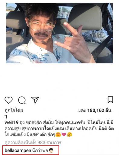 อ่ะ!! แฟนคลับคนเชียร์เบลล่า-เวียร์ไม่ต้องสั่นสะเทือน เพราะอย่างที่ "เฮียเวียร์" เคยกล่าวไว้ จิ้น "บุเพสันนิวาส" ให้เต็มที่ เพราะงานนี้ไม่สะเทือนแน่นอน และงานนี้ "เบลล่า" ราณี เลยขอออกโรงเป็นชิปเปอร์ "เวียร์เบลล่า" ด้วยตัวเอง ด้วยการเข้าไปแซวในอินสตาแกรมของหนุ่มเวียร์ที่ลงรูปตัวเองพร้อมกับแคปชั่นว่า "ลุง ขอส่งรัก ส่งยิ้ม ให้ทุกคนนะครับ ปีใหม่ไทยนี้ มีความสุข สุขภาพกายใจแข็งแรง เดินทางปลอดภัย มีสติ จิตใจแข้มแข็ง มีแฮงๆเด้อ รักๆ" โดยสาวเบลล่ามาคอมเม้นท์ตอบในรูปนี้ว่า "นึกว่าพ่อ" แหม...เข้ามาแบบนี้ แฟนๆ เลยฟินไปตามๆ กัน แถมยังแซวกลับสาวเบลล่ากันยกใหญ่ว่า "พ่อคุณทูลหัว" หรือ "พ่อของลูก" จ๊ะ