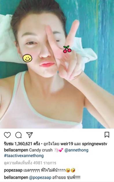 “โป๊ป ธนวรรธน์ วรรธนะภูติ” แซวเห็นแล้วใจคอไม่ดีในไอจีตามประสาคนขี้แกล้งและเปิดเผย“(หัวเราะ) พี่โป๊ปเป็นคนที่ขี้แซวค่ะ ความน่ารักของพี่โป๊ปก็คือความขี้แซว ขี้แกล้งนี่แหละค่ะ ก็เลยทำให้เป็นพี่ที่สนิทและเป็นเพื่อนร่วมงานที่สนิท เป็นคนตรงๆ เหมือนกัน เปิดเผยเหมือนกัน ก็เลยนิสัยเข้ากันได้ค่ะ แฟนคลับฟินก็เป็นความน่ารักของพี่โป๊ปแหละค่ะ (ภาพหวิว?) เบลว่าพี่โป๊ปก็คงไม่ได้คิดอะไรหรอกค่ะ ก็แกล้งแซวแหละ”