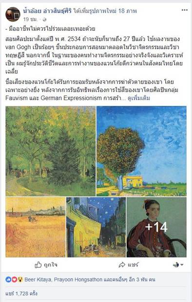 ล่าสุดมีผู้ใช้เฟซบุ๊กชื่อ ‘น้ำอ้อย อ่าวสินธุ์ศิริ’ โพสต์สเตตัสกรณีภาพวาดต้นไม้ว่า ตนสอนศิลปะมานาน 27 ปี เคยใช้ภาพวาดของ ‘วินเซนต์ แวนโก๊ะ' นับร้อยๆ ชิ้นประกอบการสอนมาตลอดในวิชาจิตรกรรมและวิชาทฤษฎีสี ระบุแบบฟันธง ‘เป็นเพียงงานเลียนแบบสไตล์การวาดภาพคุณภาพต่ำเท่านั้น’ รวมถึงยังยกตัวอย่างภาพวาดจริงเพื่อเปรียบเทียบและให้ข้อมูลในทางเห็นแย้งในหลายประเด็น...