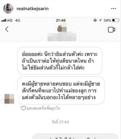และด้วยเหตุนี้ จึงทำให้สาวแน๊ตเจอชาวเน็ตส่งข้อความมาต่อว่าในไดเรกแมสเสจด้วยถ้อยคำที่รุนแรง ซึ่งสาวแน๊ตได้นำข้อความการสนทนานั้นมาโพสต์ลงในอินสตาแกรมของตัวเองโดยมีข้อความการสนทนากันดังนี้