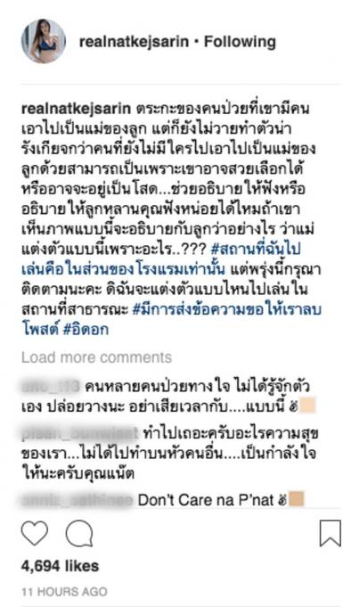 พร้อมคำบรรยายใต้ภาพที่เธอโพสต์ว่า “ตรรกะของคนป่วยที่เขามีคนเอาไปเป็นแม่ของลูก แต่ก็ยังไม่วายทำตัวน่ารังเกียจกว่าคนที่ยังไม่มีใครเอาไปเป็นแม่ของลูกด้วย สามารถเป็นเพราะเขาอาจสวยเลือกได้ หรืออาจจะอยู่เป็นโสด...