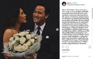 ซึ่ง เป๊ก เผยถึงเรื่องดังกล่าวผ่านทางไอจีส่วนตัวว่า ““Gala Night”, with a short story that I’d like to share. ถ้าเลื่อนมารูปที่สองคือช่อดอกไม้เล็กๆ ช่อแรกที่เป๊กตั้งใจจะเอามาให้เพลงตั้งแต่การแสดงละครเวทีของเพลงครั้งแรกเมื่อ 3 ปีก่อน (13/08/2015) แต่เนื่องจากหลายอย่างที่ไม่เป็นใจ ดอกไม้อันนั้นเลยไม่ได้ไปถึงมือของเพลงสักที แต่เป๊กยังเชื่อว่าสักวันดอกไม้ช่อนี้มันจะต้องได้ไปอยู่ในมือเพลง เป๊กเลยเก็บมันไว้ต่อให้จะแห้งและดอกจะหายไปหมดแล้วก็ตาม