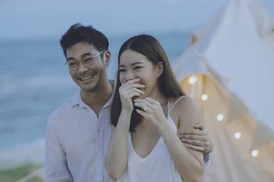 “เราก็บอกเขาว่าเดี๋ยวเราไปเดินเล่นข้างล่างกันตอนเย็นๆ ก่อนพระอาทิตย์ตก ระหว่างทางเพื่อนสนิทก็มาจัดเป็นป้ายไม้วางอยู่ตามทางชายหาด เขียนโค้ดต่างๆ ในแบบที่เขาชอบ สุดทางก็จะมีเต็นท์ที่เราเซ็ตขึ้นไว้เพราะเขาเป็นคนชอบฟีลนี้ จังหวะที่เขาเห็นเต็นท์เขาคงรู้แล้วล่ะว่าเรากำลังจะทำอะไร ผมนั่งอยู่บนพื้น ก็พูดกับเขาว่า เนมก็มีความสุขมากๆ ในทุกๆ วันที่อยู่กับป้อ อยากจะขอดูแลป้อ ดูแลกันไปตลอดเลยนะ คือพูดประมาณนี้จำไม่ได้แล้ว ตื่นเต้นมากตอนนั้น ตื่นเต้นกว่าเล่นคอนเสิร์ตใหญ่อีก”