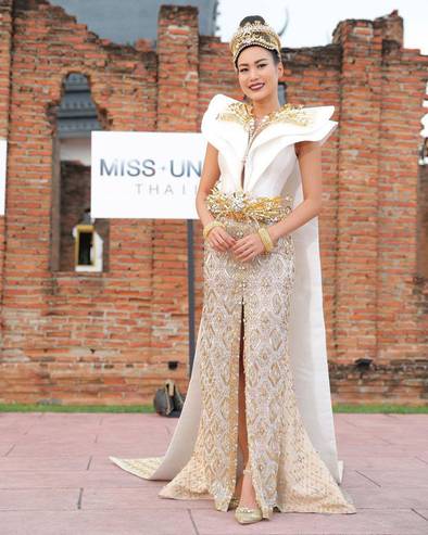 ส่วนที่ 1 “ชุดไทยประยุกต์” ออกแบบชุดขึ้นใหม่โดยดัดแปลงจากชุดไทยพระราชนิยมโดยใช้ผ้าไหม เพิ่มความ ทันสมัยด้วยชายผ้า ฟอร์มไหล่ยกสูงมาจากชุดไทยพระราชนิยมมาประยุกต์โดยอิงโครงสร้างมาจากหน้าช้าง ส่วนลายผ้าดัดแปลงจากลายประจำยามและลายกระจัง ซึ่งเป็นลายไทยมาตรฐาน ปักและรีดลายด้วยคริสตัล จากสวารอฟสกี้