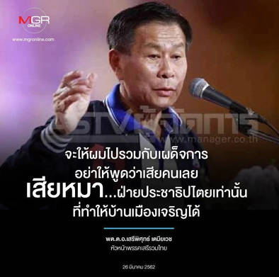 ทั้งนี้ พล.ต.อ.เสรีพิศุทธ์ ยังกล่าวอีกว่า “จะให้ผมไปรวมกับเผด็จการอย่าให้พูดว่าเสียคนเลย เสียหมาเลยดีกว่า เพราะฝ่ายประชาธิปไตยเท่านั้นที่จะทำให้บ้านเมืองเจริญได้ คำพูดของผม 10 ปีที่แล้วเป็นอย่างไร วันนี้ก็เป็นอย่างนั้น”