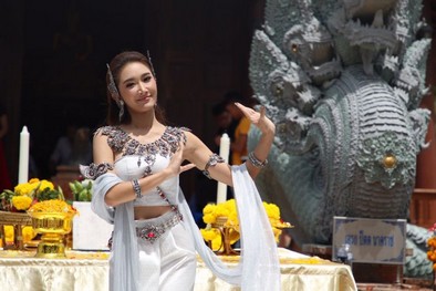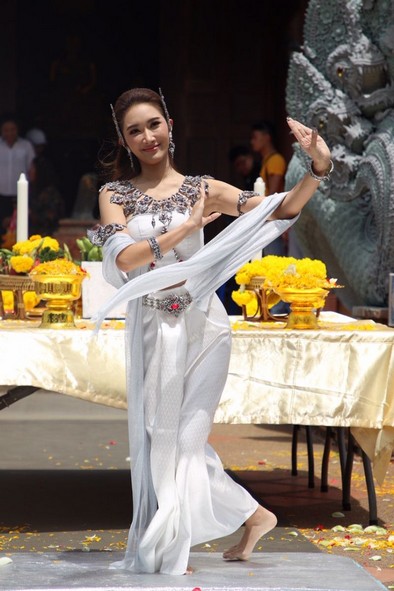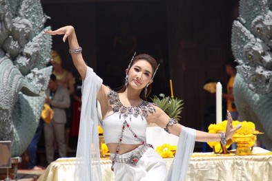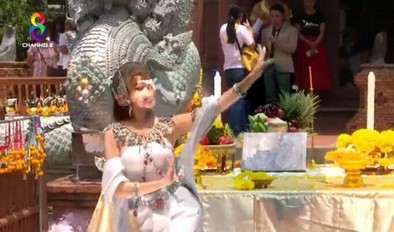 โดยในพิธีพราหมณ์จัดทำพิธี พร้อมบายศรีชุดใหญ่ มีของไหว้ครบเครื่อง จากนั้น พราหมณ์ได้เริ่มท่องมนต์บูชาเสียงดังกังวานไปทั้งงาน หลังเสร็จพิธี ยีนได้เริ่มร่ายรำบวงสรวง โดยมีสื่อมวลชนทุกช่องได้บันทึกภาพวิดีโอกันอย่างหนาแน่น พร้อมไลฟ์สดเพื่อเผยแพร่บนเฟสบุ๊ค ปรากฏว่า ระหว่างรำบวงสรวง เกิดเงาภาพซ้อนบนหน้าของยีน คล้ายพญานาค นานถึง 20 วินาที โดยสามารถแคปภาพเอาไว้ได้ บนเพจเฟสบุ๊คของช่อง8 ขณะที่กำลังถ่ายไลฟ์สด ผู้ที่พบเห็นต่างประหลาดใจกับเหตุการณ์ดังกล่าว นอกจากนี้ เพื่อนนักแสดงอย่าง เอ พศิน ก็รู้สึกได้ถึงเหตุการณ์อาถรรพ์เช่นกัน เพราะขณะขับรถมาที่วัดแห่งนี้ เจ้าตัวก็ได้กลิ่นธูปตลอด ก่อนจะเริ่มทำพิธีอีกด้วย