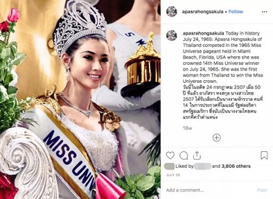 โดย ปุ๊ก อาภัสรา หงสกุล เธอคือนางสาวไทย ปี พ.ศ. 2507 และสามารถครองตำแหน่งนางงามจักรวาลได้สำเร็จในปี ค.ศ. 1965 ซึ่งเป็นนางงามจักรวาลคนแรกของประเทศไทย