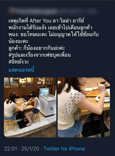 เป็นเรื่องให้ชาวโซเชียลตำหนิติติงกันมากมาย เมื่อมีคนแชร์ภาพของ 2 สาวนั่งกินขนมหวานในร้านขนมหวานชื่อดัง พร้อมกับเอาช้อนป้อนขนมให้กับน้องหมาที่พามาด้วย และเมื่อพนักงานไปแจ้ง ก็ได้ตอบกลับว่า “ก็น้องอยากกินอ่ะค่ะ” จนถูกวิจารณ์ถึงพฤติกรรมอย่างล้นหลาม
