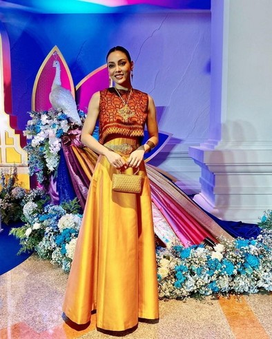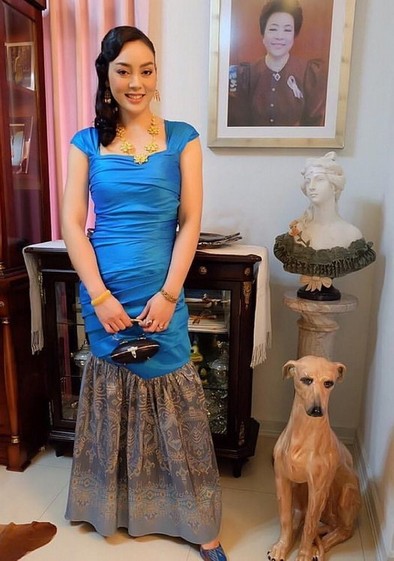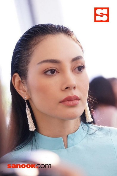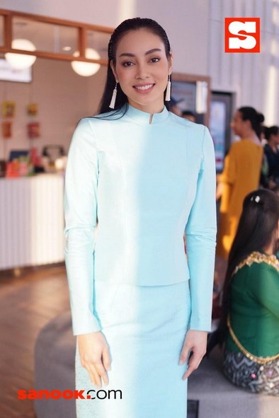 โดยชุดที่เธอเลือกมาใส่ในวันนี้ เป็นชุดไทยจิตรลดาสีฟ้า ที่ตัดด้วยผ้าไหมไทยอย่างประณีต อีกทั้งหน้าผมก็ยังหวานละมุนชวนมอง เช่นเดียวกับกิริยาท่าทางการวางตัวของเธอตลอดทั้งงานที่ดูสง่างามไม่แพ้กัน