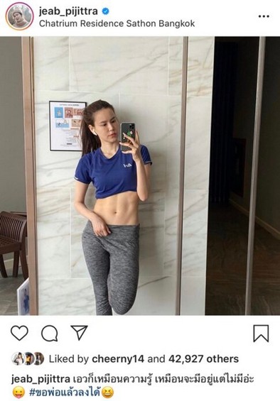 ล่าสุด เจี๊ยบ โพสต์รูปหลังจากออกกำลังกายเสร็จ อวดความปังของกล้ามท้องให้เห็นจะจะ ระบุข้อความ “เอวก็เหมือนความรู้ เหมือนจะมีอยู่แต่ไม่มีอ่ะ #ขอพ่อแล้วลงได้”