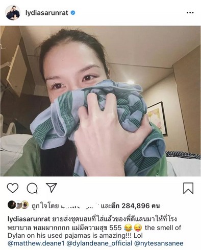 ล่าสุดลีเดียได้เข้าใกล้ลูกๆ มากขึ้น เมื่อคุณยายได้ส่งของขวัญมาให้คนเป็นแม่ นั่นก็คือ ชุดนอนของลูกชายที่ยังไม่ได้ซัก โดยสาวลีเดียโพสต์รูปพร้อมกับรอยยิ้มแห่งความสุขของคนเป็นแม่ และแคปชั่นว่า “ยายส่งชุดนอนที่ใส่แล้วของพี่ดีแลนมาให้ที่โรงพยาบาล หอมมากกกก แม่มีความสุข 555 the smell of Dylan on his used pajamas is amazing!!! Lol”