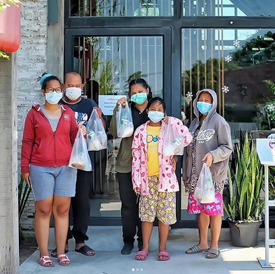 “เกิดจากเราสองคนคุยกันอยากแจกอาหารให้คนจนหรือคนที่เดือดร้อน เพราะตอนที่ร้านเราไฟไหม้ มีคนเข้ามาให้กำลังใจเราเยอะ มาอุดหนุน ช่วยแชร์ จนเราหลุดพ้นจากหนี้สินตรงนั้น เราก็อยากตอบแทนสังคม เราก็คุยกับเด็กๆในร้านคือร้านก็จะขายไม่ดี กระทบเหมือนกัน แต่เรายังจ่ายเงินเดือนลูกน้อง ยังไม่ได้ลดเงินเดือนใคร เด็กๆในร้านก็ไม่มีแพลนไปไหน เลยตั้งใจทำอาหารขายและทำอาหารแจกกันดีกว่า วันแรกๆ แจกไป 20-30 ชุด ซึ่งตอนแรกเราก็ควักเงินเราเอง แต่พอหลายๆคนช่วยกระจายข่าว ตอนนี้ก็มีคนมาบริจาควัตถุดิบมาให้ บางคนเอาผักมาให้ อย่างช่วงไข่แพง เจ้าของฟาร์มก็ลงไข่มาให้เลย บางคนเอาผลไม้มาให้ เพราะเราไม่รับเงินบริจาค ต้องขอบคุณพี่ๆที่นำวัตถุดิบมาให้ ตอนนี้ต่อวันก็แจกเป็นหลักร้อยกล่อง บางคนนั่งมอเตอร์ไซค์ นั่งซาเล้งมารับอาหารที่ร้าน ทั้งๆที่ร้านเราอยู่ไกล เค้าก็บอกว่าเดือดร้อนจริงๆ”