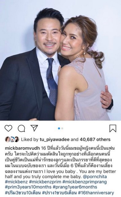 ล่าสุดความรักของทั้งคู่เดินทางมายาวนานถึง 16 ปี รวมถึงเป็นปีที่ 6 ของชีวิตการแต่งงานด้วย ทั้งนี้ มิค ได้โพสต์รูปและข้อความในใจที่มีต่อภรรยาสุดที่รักว่า
