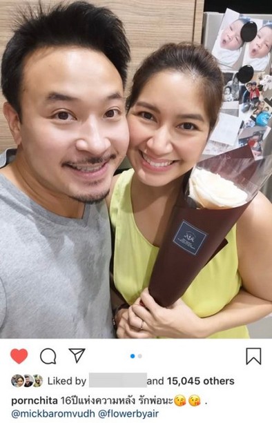 เช่นเดียวกับในไอจีของสาว เบนซ์ ซึ่งได้โพสต์รูปคู่สามี ระบุข้อความว่า "16 ปีแห่งความหลัง รักพ่อนะ 😘😘"