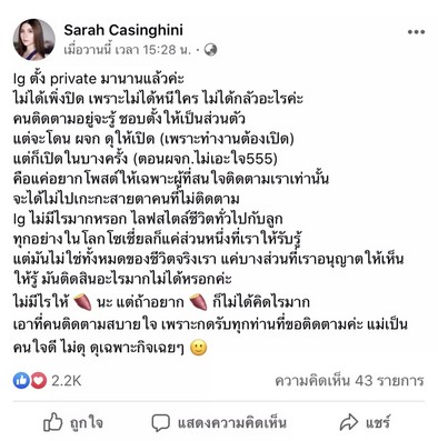 หลังจากที่ถูกโยงให้เกี่ยวข้องกับเรื่องนี้ ซาร่า คาซิงกินี เลยออกมาโพสต์ข้อความผ่านทางเฟซบุ๊กส่วนตัว ซึ่งมีข้อความดังนี้ "Ig ตั้ง private มานานแล้วค่ะ ไม่ได้เพิ่งปิด เพราะไม่ได้หนีใคร ไม่ได้กลัวอะไรค่ะ คนติดตามอยู่จะรู้ ชอบตั้งให้เป็นส่วนตัว แต่จะโดน ผจก ดุให้เปิด (เพราะทำงานต้องเปิด)