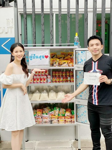"หมิง" อรินท์มาศ บุญครองทรัพย์ อดีตนางสาวไทย และ "หมอสอง" นพ.นพรัตน์ รัตนวราห ปันน้ำใจใส่ ตู้ปันสุข สู้โควิด-19