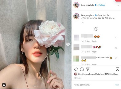 ซึ่งรูปที่สาวโบว์โพสต์กับดอกไม้ ที่เห็นแล้วก็ต้อบอกว่าหวานมาก และสวยมากเป็นพิเศษ ทำเอาแฟนๆต่างเข้ามาคอมเมนต์ถึงความน่ารักนี้กันอย่างมาก