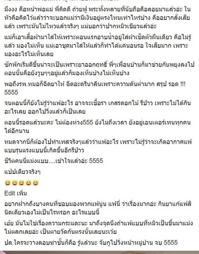 จนตอนนี้ก็ยังไม่รู้ว่าแพ้อะไร อาจจะเชื้อรา เกสรดอกไม้ รึป่าว เพราะไม่ได้กินอะไรเลย ออกไปวิ่งแล้วก็เป็นเลย ตอนนี้รอดแล้วนะคะ ไม่ต้องห่วง555 ยังไม่ถึงเวลา ยังอยู่เอนเตอร์เทนทุกคนได้อีกนาน หมดจากนี่ก็ต้องไปทำเทสจริงๆ แล้วว่าแพ้อะไร เพราะไม่รู้ว่าจะเกิดอากาศแพ้แบบรุนแรงแบบนี้เกิดขึ้นอีกรึป่าว ชีวิตคนนี่แม่-แบบ....เข้าใจแล้วอ่ะ 5555 แปปเดียวจริงๆ"