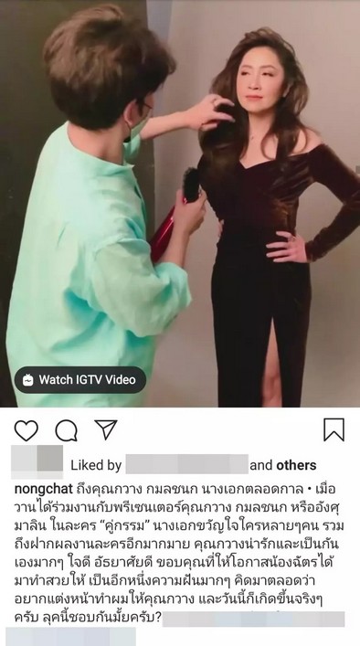 ด้าน กวาง กมลชนก ก็ได้คอมเมนต์ในไอจี น้องฉัตร ถึงการทำงานร่วมกันไว้ว่า “ขอบคุณน้องฉัตรมากมายที่เนรมิตหน้าและผมให้พี่ออกมาได้สุดยอด พี่ประทับใจมากๆ ดีใจจริงๆ ที่ได้ร่วมงานกันนะคะ แอบปลื้มและชื่นชมน้องฉัตรมานาน...พี่มีความสุขกับการทำงานชิ้นนี้มากๆ ค่ะ”.