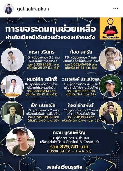 อยู่ดีๆ ก็ถูกโยงเรื่องขอรับเงินบริจาคซะงั้น สำหรับลูกทุ่งหนุ่มชื่อดัง ก๊อท จักรพันธ์ ครบุรีธีรโชติ หลังมีเพจหนึ่งได้เขียนข้อความเอาไปโยงเรื่องขอรับเงินบริจาค เกี่ยวกับการขอระดมทุนช่วยเหลือผ่านโซเชียลมีเดียของคนดัง ซึ่งมีทั้ง ฌอน บูรณะหิรัญ และดาราคนดังอีกหลายคนถูกโยงด้วย พร้อมกับเขียนว่าแต่ละคนได้รับเงินบริจาคไปทั้งหมดเท่าไร