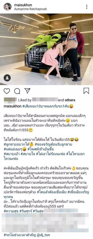โดย ใหม่ สุคนธวา โพสต์ภาพตอนไปจองรถกับ ดีเจต้น และทำท่าจูบพุงสามี พร้อมทั้งเขียนแคปชั่น “#เสียทอง 10 บาทแลกกับรถ 1 คัน เสียทอง 10 บาทให้สามีตอนทายเพศลูกผิด บอกเลยเด็กๆ เพราะดิฉันวางแผนในหัวจะเอาคืนทีหลังค่ะ บอกเลย...คุ้ม! และแพงกว่าเยอะ เจ็บๆ จุกๆ ในวันเดียว หัวเราะทีหลังดังกว่า 555