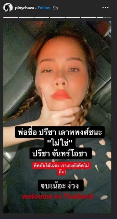 “อีหยีเมิงเป็นแฝดกรูตอนไหนแว้!! คัยเปงคงทัม” ล่าสุด พลอย โพสต์อีกครั้งด้วยว่า “พ่อชื่อปรีชา เลาหพงศ์ชนะ ไม่ใช่ ปรีชา จันทร์โอชา คิดกันได้เนอะ เราเองยังคิดไม่ถึง จบเน้อะ ง่วง welcome to thailand”