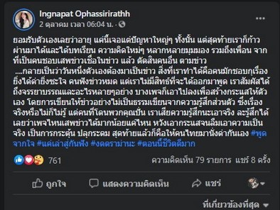 โดยอิงอิง เผยข้อความในเฟซบุ๊ก Ingnapat Ophassirirathh ว่า "ยอมรับตัวเองเลยว่าอายุแค่นี้เจอแต่ปัญหาใหญ่ๆ ทั้งนั้น แต่สุดท้ายเราก็ก้าวผ่านมาได้และได้บทเรียน ความคิดใหม่ๆ หลากหลายมุมมอง รวมถึงเพื่อน จากที่เป็นคนชอบเสพข่าวเชื่อในข่าว แล้วตัดสินคนอื่น ตามข่าว กลายเป็นว่าวันหนึ่งตัวเองต้องมาเป็นข่าว สิ่งที่เราทำได้ คือ คนมักชอบกุเรื่อง ยิ่งได้ด่ายิ่งซะใจ คนฟังข่าวหมด แต่เราไม่มีสิทธ์ที่จะได้ออกมาพูด เราสัมผัสได้ถึงจรรยาบรรณและอะไรหลายๆ อย่าง