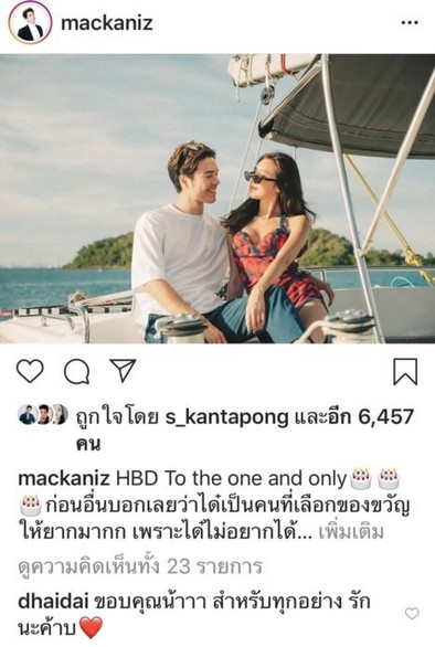 แต่งเลยมั้ย!-เป็นการอวยพรวันเกิดที่หวานมาก สำหรับ แม็ก วีรคณิศ ที่นานๆ จะโพสต์ภาพคู่กับหวานใจรุ่นน้องได๋ได๋ ล่าสุดโพสต์ภาพครั้งพาหวานใจไปเที่ยวทะเล พร้อมกับเขียนคำอวยพรวันเกิดหวานๆ ยาวเหยียด ว่า
