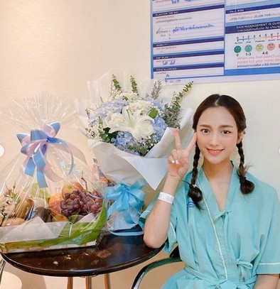 "ตอนนี้ขอยาหมอ ก็บรรเทาอาการได้ วันนี้เลยรู้สึกมีเรี่ยวแรง สดชื่น เพราะอยากกลับบ้านแล้ว ค่ารักษาที่นี่สูงด้วย รีบหายดีกว่า ขอบคุณทุกคนที่เป็นห่วงนะคะ ป.ล. พระเอกโอ๊ค บินมาเยี่ยมด้วยความเป็นห่วงถึงที่พร้อม ผลไม้ของบำรุงคนเฝ้าไข้ เอ้ยคนป่วยด้วย นางมาภูเก็ตพอดีเลยมาหาค่ะ"