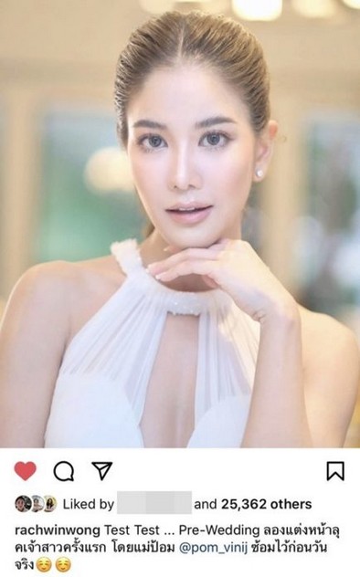 ล่าสุดวันที่ 8 พ.ย.2563 ก้อย รัชวิน ถือโอกาสใช้ช่วงเวลาที่มีอยู่ก่อนถึงวันจริง ซ้อมแต่งหน้าและทำผมลุกส์เจ้าสาวไปพลางๆ กับเมกอักอาร์ติสต์ตัวแม่ ป้อม วินิจ โดยเจ้าตัวได้โพสต์รูและข้อความว่า “Test Test ... Pre-Wedding ลองแต่งหน้าลุกส์เจ้าสาวครั้งแรก โดยแม่ป้อม @pom_vinij ซ้อมไว้ก่อนวันจริง☺☺”